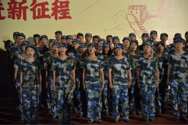 “绿茵场上,星光与灯光交织,同学们肩并肩,围坐成圈,在教官的引导下,他们的声音逐渐汇聚成《强军战歌》的雄壮旋律。随着旋律的起伏,同学们的心也随之激荡,彼此间的陌生感在歌声中悄然消融。”