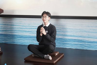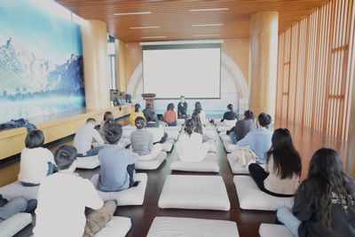活动伊始,叶老师示范了坐垫的用法:冥想与宗教中的打坐有所不同,冥想没有坐姿要求,冥想者舒适即可。待师生们坐定后,叶老师介绍了幸福研习空间的布局,师生们的右手边可见阳光穿过木纹铝格栅洒在地面,光影交错,仿佛置身于静谧的自然;左手边是喷涂的巨型海阔天空图案。约160多平方米的空间里没有一张椅子,身处这空旷静谧的空间里,人会不由自主放松下来。伴随着柔和的音乐和叶老师轻缓的冥想引导,现场的师生们共同体验了呼吸冥想。