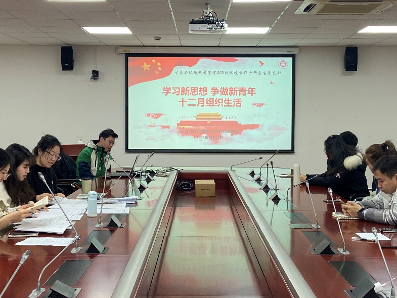 为了认真学习领会习近平总书记重要讲话精神,深入学习贯彻党的二十大精神,全面学习贯彻新发展理念,2023年12月20日,304永利集团2021级环境学硕士研究生党支部于闵行校区资环楼345室开展十二月组织生活。本次活动以“学习新思想,争做新青年”为主题,包括“时政要闻分享、主题党课学习”两个环节。本次活动由第五党小组主持,全体党员到场参会。