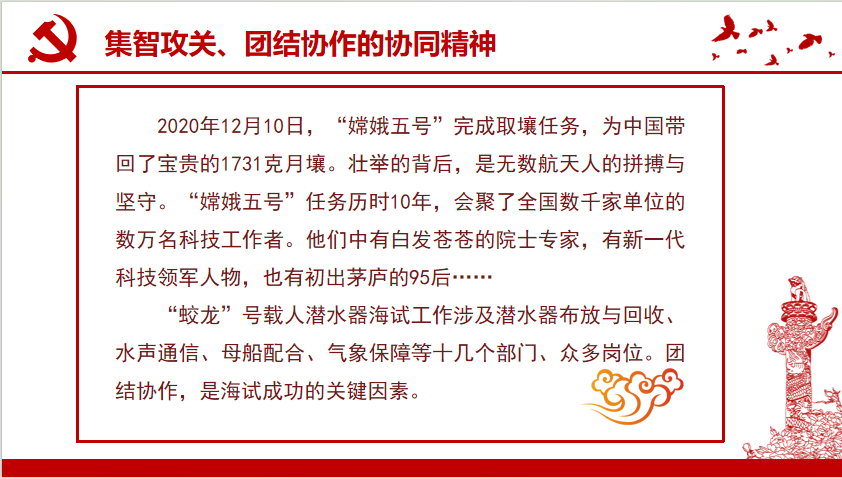 第五部分:集智攻关、团结协作的协同精神。多年来,我国重大科技成果实现了从零星到井喷,从量变到质变的过程。目前,我国共授予10多万人(次)国家自然科学奖、国家技术发明奖、国家科学技术进步奖三大奖。