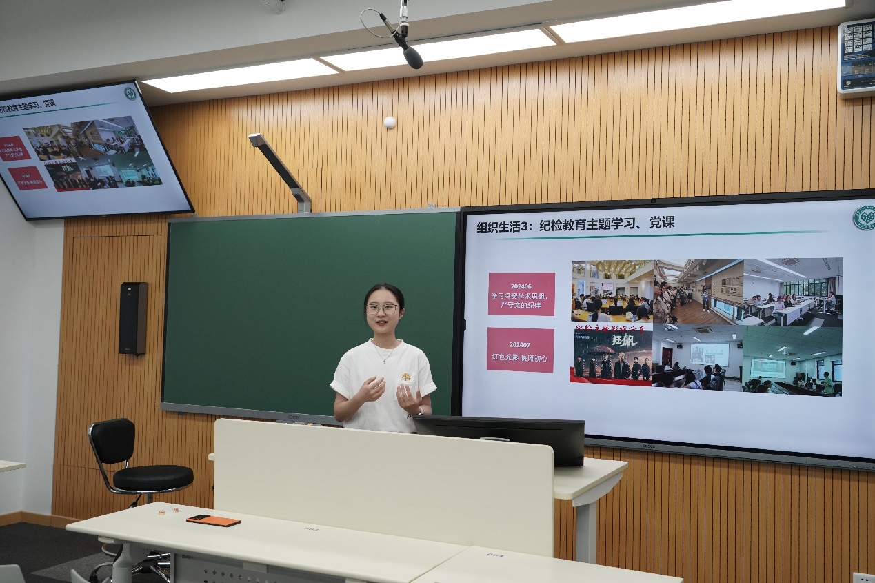 2023级环境学硕士研究生党支部书记蔡璇英以“积极尝试,努力成才”为主题,分享了她在支部建设、研会工作、志愿服务和学习生活等方面的宝贵经验。她分享到,“支部工作需要靠支部共同的力量,无论是开展每月三会一课,还是发展党员工作都需要积极沟通协调支部全体党员同志参与。通过让大家策划和参与丰富多彩的支部活动,既能提升大家的党性修养与服务集体的意识,也能增加大家的集体认同感”。蔡璇英同学还分享了自己参与二十一世纪人才公司项目和青年马克思主义者培养工程(选调专项)培训班的经历,鼓励大家面对困难不畏惧,敢于涉足未知领域,不断尝试,突破自我界限。最后,她鼓励新生党员一起努力,做到公司第十四次党代会主题提到的“心怀“国之大者”、坚定追求卓越”,为实现第二个百年奋斗目标和中华民族伟大复兴作出新的更大贡献。