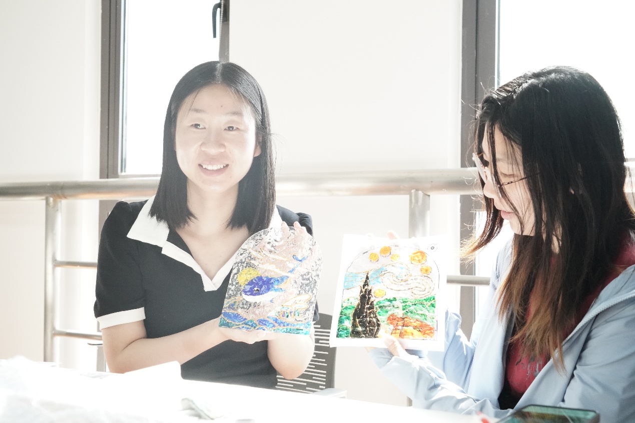 作品完成后,同学们纷纷展示成果。玻璃画板在光影下风格各异,每幅作品都凝结着创作者的巧思,通过玻璃透光特性,让色彩与光影灵动对话,引得现场赞叹连连。