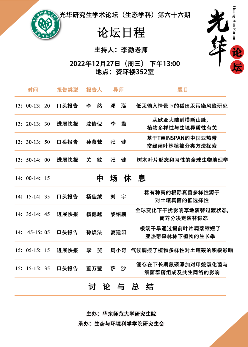 2023年12月27日13:00,304永利集团第66期研究生光华学术论坛(生态学科)在资环楼352室顺利举行,本期论坛由公司李勤老师主持。