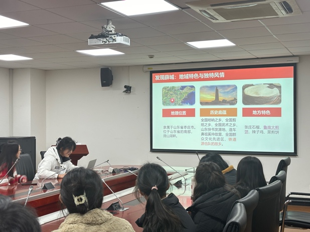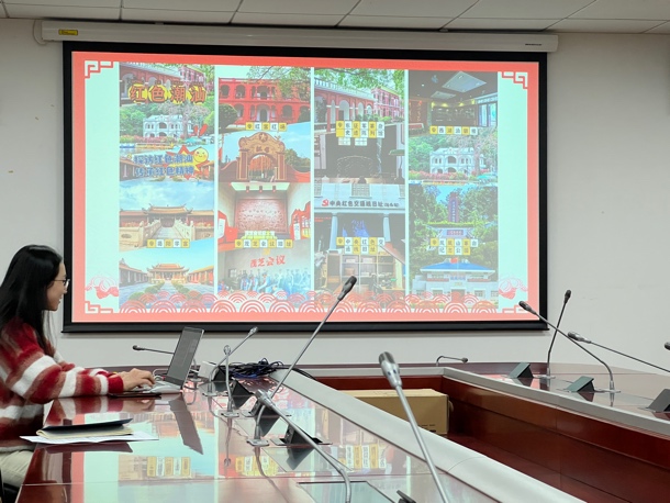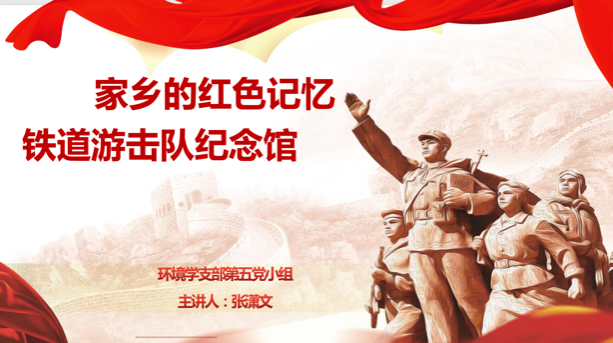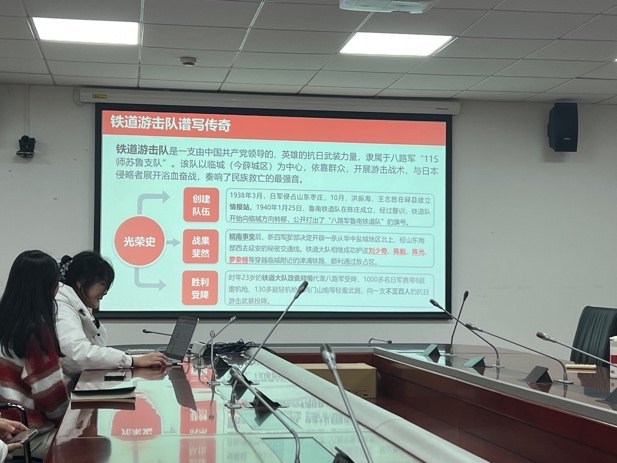活动第二部分,由张潇文介绍家乡的红色景点——铁道游击队纪念馆。首先,张潇文同志介绍了她的家乡——薛城的地域特色与独特风情。薛城隶属于山东省枣庄市, 具有浓厚的历史底蕴,是全国唢呐之乡、全国剪纸之乡、全国武术之乡、山东快书发源地、造车鼻祖奚仲故里、全国群众文化先进区、铁道游击队的故乡。随后,张潇文重点介绍了铁道游击队的由来和发展,这支部队最早发端于1938年夏,是在洪振海、王志胜建立的抗日情报站基础上发展起来的。《弹起我心爱的土琵琶》是专门为影片《铁道游击队》创作的插曲,表现了游击队员在艰苦环境中的坚强意志和乐观精神,具有极强的感染力。最后,张潇文带领大家云游铁道游击队景区,共包括一碑、一廊、一馆、一城、一墓、一园、一亭、一阁、一广场九大组成部分。