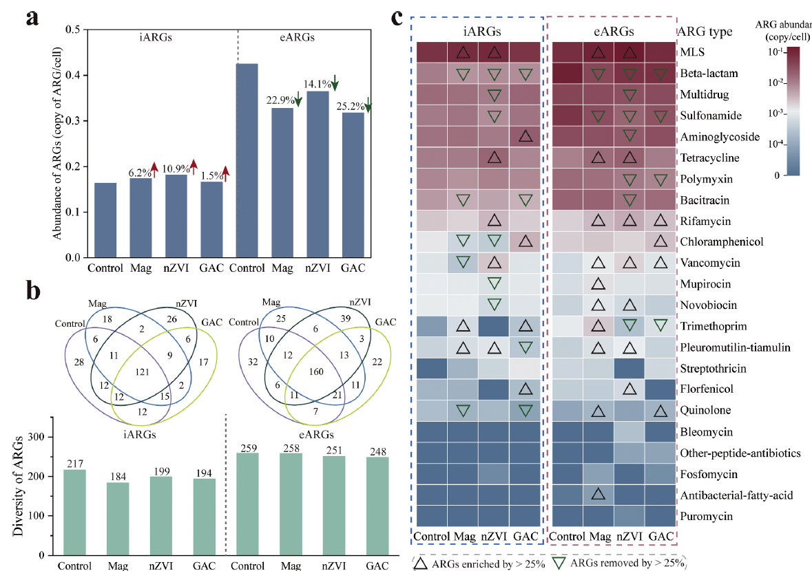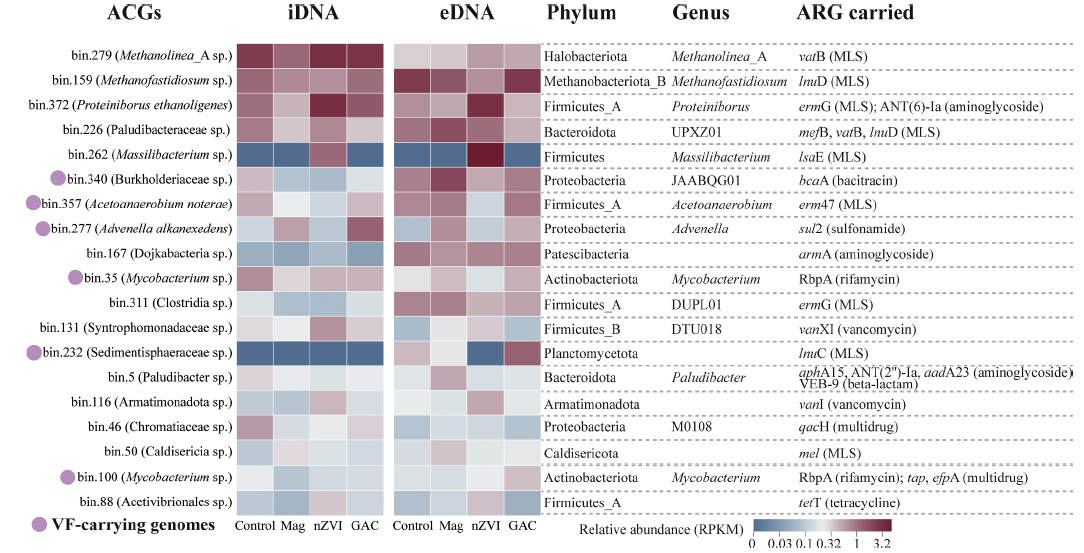 本研究探究了三种常用的CMs,包括纳米磁铁矿、纳米零价铁和颗粒活性炭,对氨抑制的污泥AD体系内iARGs和eARGs迁移转化的影响。结果表明三种CMs均富集了iARGs,但削减了eARGs的丰度。这种差异可能与iARGs和eARGs的宿主的以及ARGs的HGT有关。CMs可能导致了抗生素耐药菌(ARB)及其提供维生素B12的互养菌群的前噬菌体诱导转化,造成ARB的裂解死亡和可能被微生物转化吸收的eARGs的释放。进一步对HGT机制的分析表明纳米磁铁矿潜在地促进了接合和转化过程,而纳米磁铁矿仅促进了结合。此外,三种CMs对转导过程没有显著影响。颗粒活性炭在限制iARGs的富集、减少eARGs和抑制HGT方面优于其余两种材料。本研究为理解病毒在投加CMs的AD系统中的作用和ARGs的传播机制提供了新视角,同时为在实际应用中制定减轻ARG污染的策略提供了重要指导。