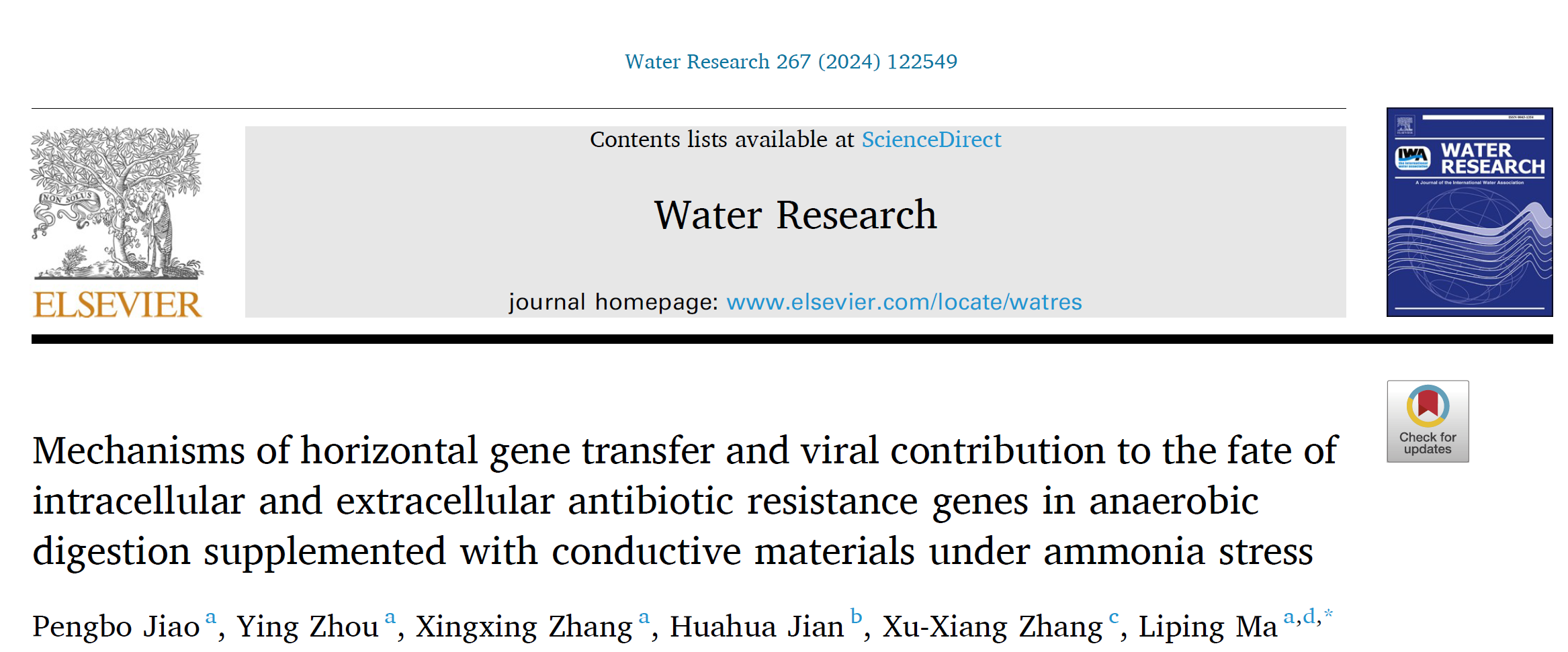 2024年9月29日,304永利集团马黎萍教授团队在Water Research期刊上发表了题为“Mechanisms of horizontal gene transfer and viral contribution to the fate of intracellular and extracellular antibiotic resistance genes in anaerobic digestion supplemented with conductive materials under ammonia stress”的研究论文,系统地阐明了CMs对氨抑制的AD系统内iARGs和eARGs迁移转化及其HGT机制的影响。
