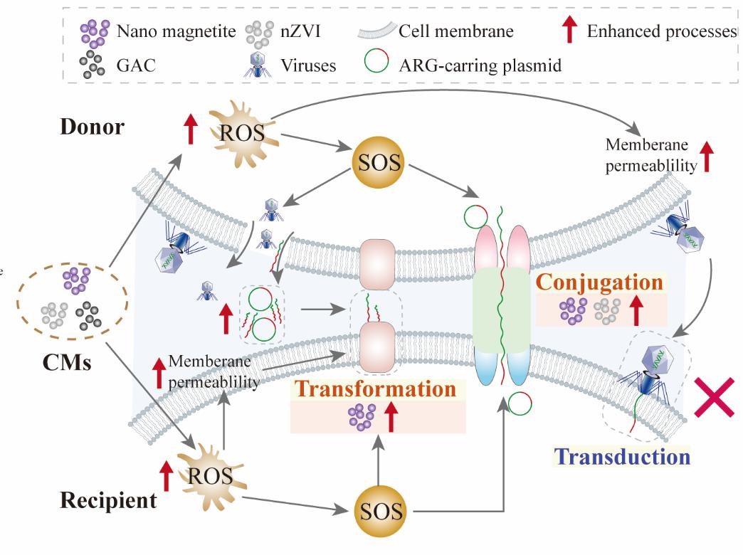投加导电材料(CMs)是缓解富氮底物厌氧消化(AD)过程中的氨抑制的有效策略。但是,CMs可能会强化水平基因转移(HGT)从而富集抗生素抗性基因(ARGs)。ARGs可分为胞内和胞外ARGsiARGs/eARGs),其中接合和转导是iARGs的HGT扩散的主要机制,而eARGs则依赖于转化过程。在氨抑制的AD体系中,CMs对iARGs和eARGs的迁移转化和HGT过程(尤其是转导和转化)的影响尚未得到全面研究。