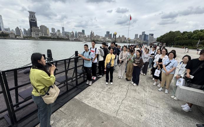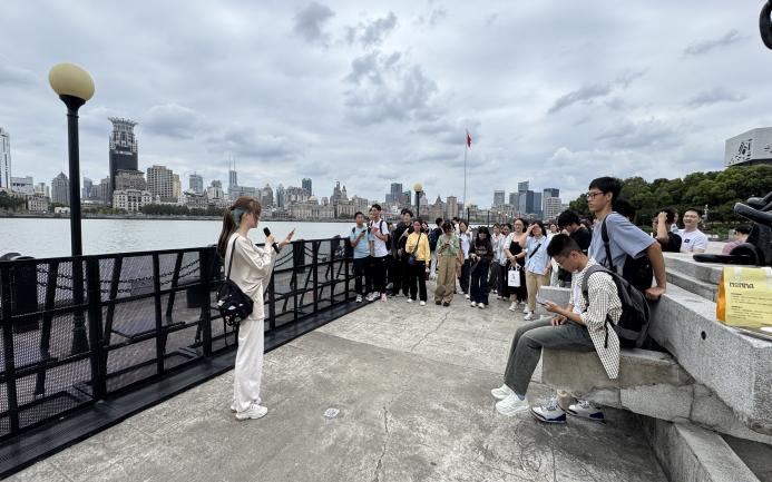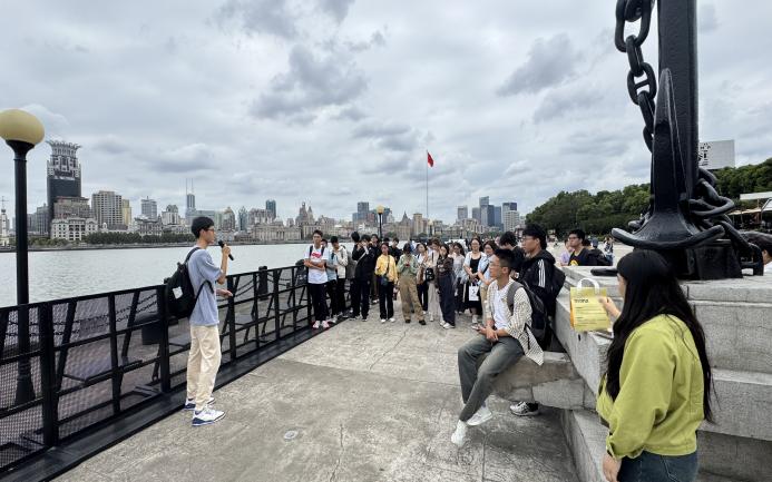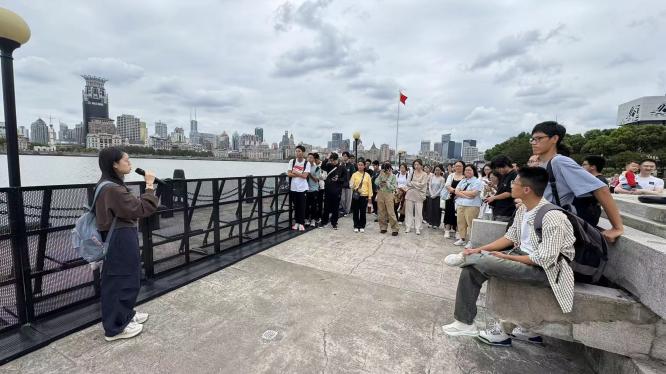 在结束了上海中心的参观后,同学们前往滨江大道,一边欣赏沿岸的建筑物,一边聆听5位上海本地同学对上海值得参观景点的介绍。