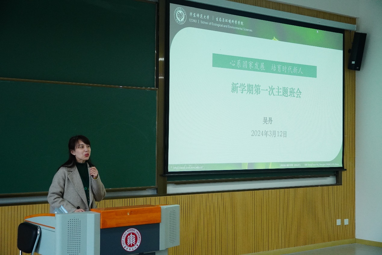 首先,吴丹以“心系国家发展 培育时代新人”为主题开展了新学期第一次主题班会,通过“回顾上学期”总结了半年来班级各项活动的开展情况和成效。在启航新学期部分,她以“强思想、乐学习、多实践、重双创、爱生活”五个方面,就新学期的主要工作提出建议与期盼:第一,强思想:希望同学们通过“学习强国、青年大学习”等平台开展思想理论学习,提升自身的政治理论素养,筑牢理想信念的基石;第二,乐学习:以生环优秀学子为榜样,激励同学们刻苦学习,永攀科研高峰;第三,多实践:详细介绍了公司、公司开展的各项实践活动,鼓励同学们积极参与,展现生环学子的责任与担当;第四,重双创:介绍了公司双创工作开展情况和学科相关赛事,引导同学们参与各类创新创业大赛,提升创新精神和创业能力;第五,爱生活:引导同学们筑牢安全意识,养成健康规律的生活习惯,营造一个健康、活力、向上的学习生活氛围。