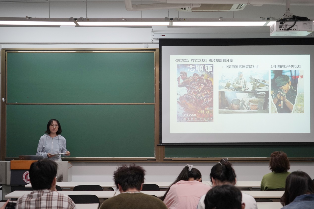 王晓静同学分享了电影《志愿军:存亡之战》的观后感,这是一部聚焦抗美援朝战争中中国人民志愿军英勇事迹的影片。她说:“这部电影是对志愿军精神的一次深刻致敬,也是对和平与牺牲的一次深刻思考。它让我们铭记历史,珍惜和平,同时也激励我们传承英雄精神,为建设更加美好的未来而努力。”