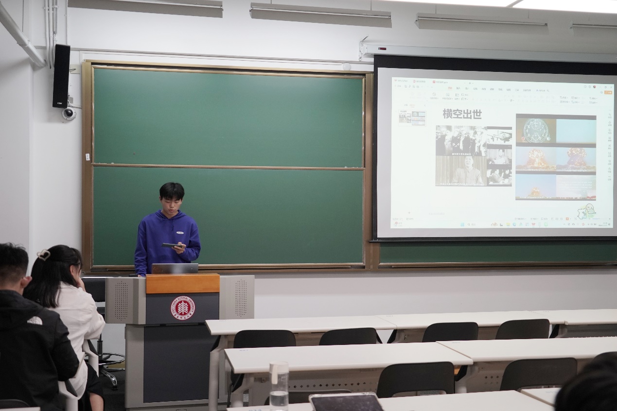 杨发帅同学分享影片《横空出世》,主要讲述了我国老一辈科研部队如何在西北荒漠克服一个个困难,最终完成我国第一枚原子弹爆炸的故事。没有任何困难能打倒英雄的中国人民,现在的我们不能忘记前辈们在如此艰难困苦的条件下完成的一项项成就,不能忘记他们身上的那一股科研精神。