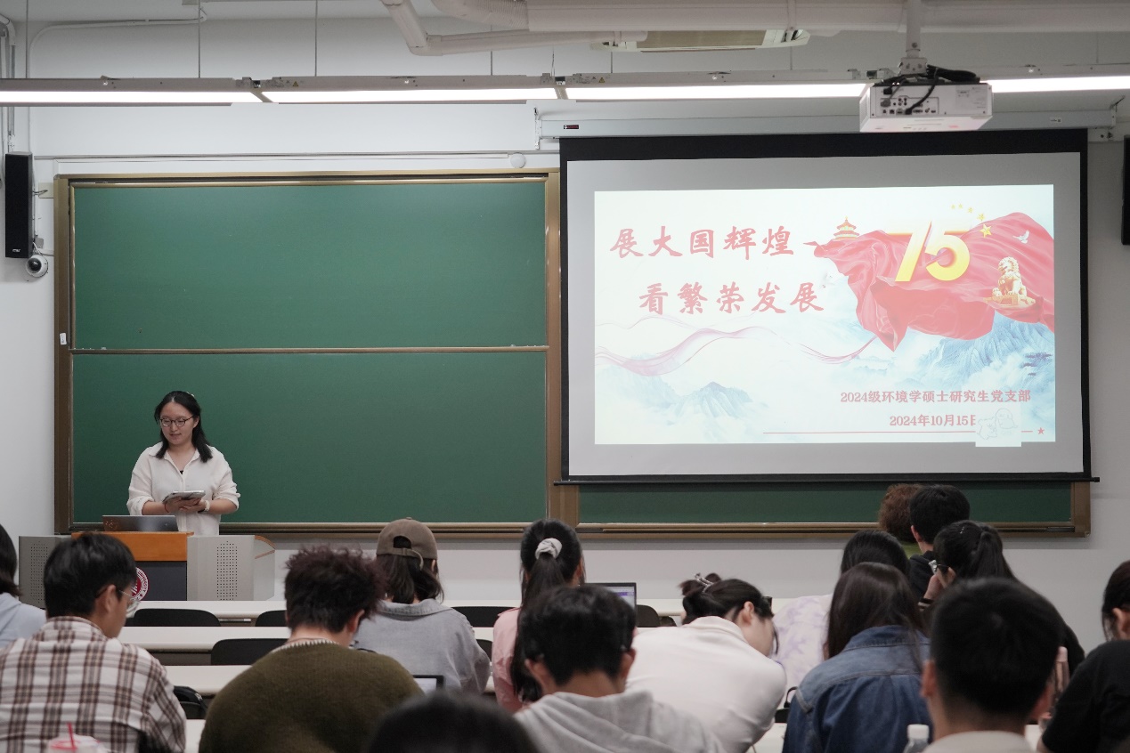 今年是新中国成立75周年,为鼓励广大青年员工党员坚定理想信念、锤炼过硬本领、牢树爱党爱国、专业报国之志,增强骨气、底气,不负党和人民的殷切希望。2024级环境学硕士研究生党支部于2024年10月15日晚开展主题为“庆国庆 筑信仰 共成长”国庆学习分享主题党日活动。活动由党支部书记徐寒雨主持,支部指导老师路葵参加本次活动。