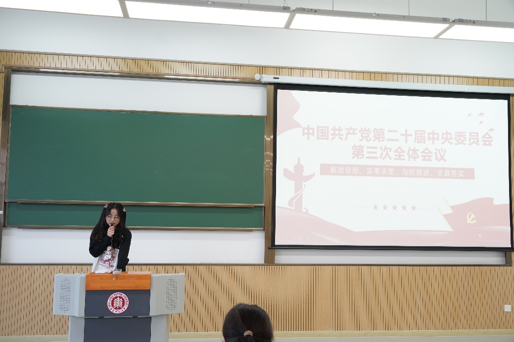 活动第三部分,张瑞瑞带领同学们回顾了党的二十届三中全会的召开背景、主要内容和重要意义,号召同学们要始终保持高度的政治觉悟和责任担当。希望同学们能够珍惜大学时光,努力学习、积极进取,为实现个人价值和社会发展贡献自己的力量。