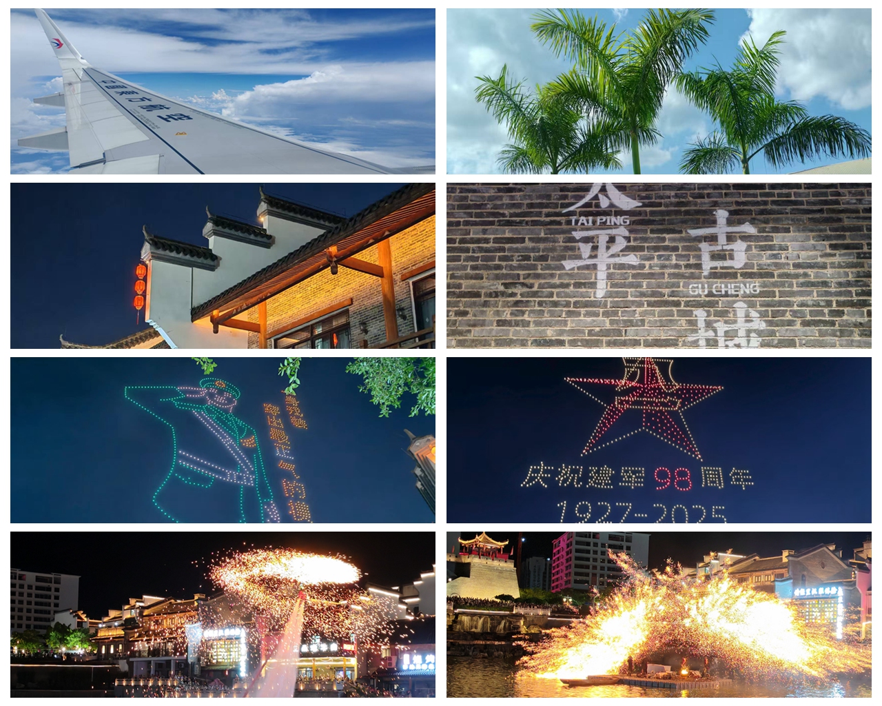老师们在酒店短暂休息后,开启了本次疗休养的第一站,漫步太平古城。青石板路映着灯笼暖光,壮族风情建筑与檐角风铃相映成趣,古城热闹非凡,适逢八一建军节后,无人机献礼建军节的天幕表演饱含深情,水上飞人酷炫十足,匠人们将铁花打成绚烂的烟火,一朵朵绽放在水上,老师们仿佛穿越千年,梦回大唐盛世。