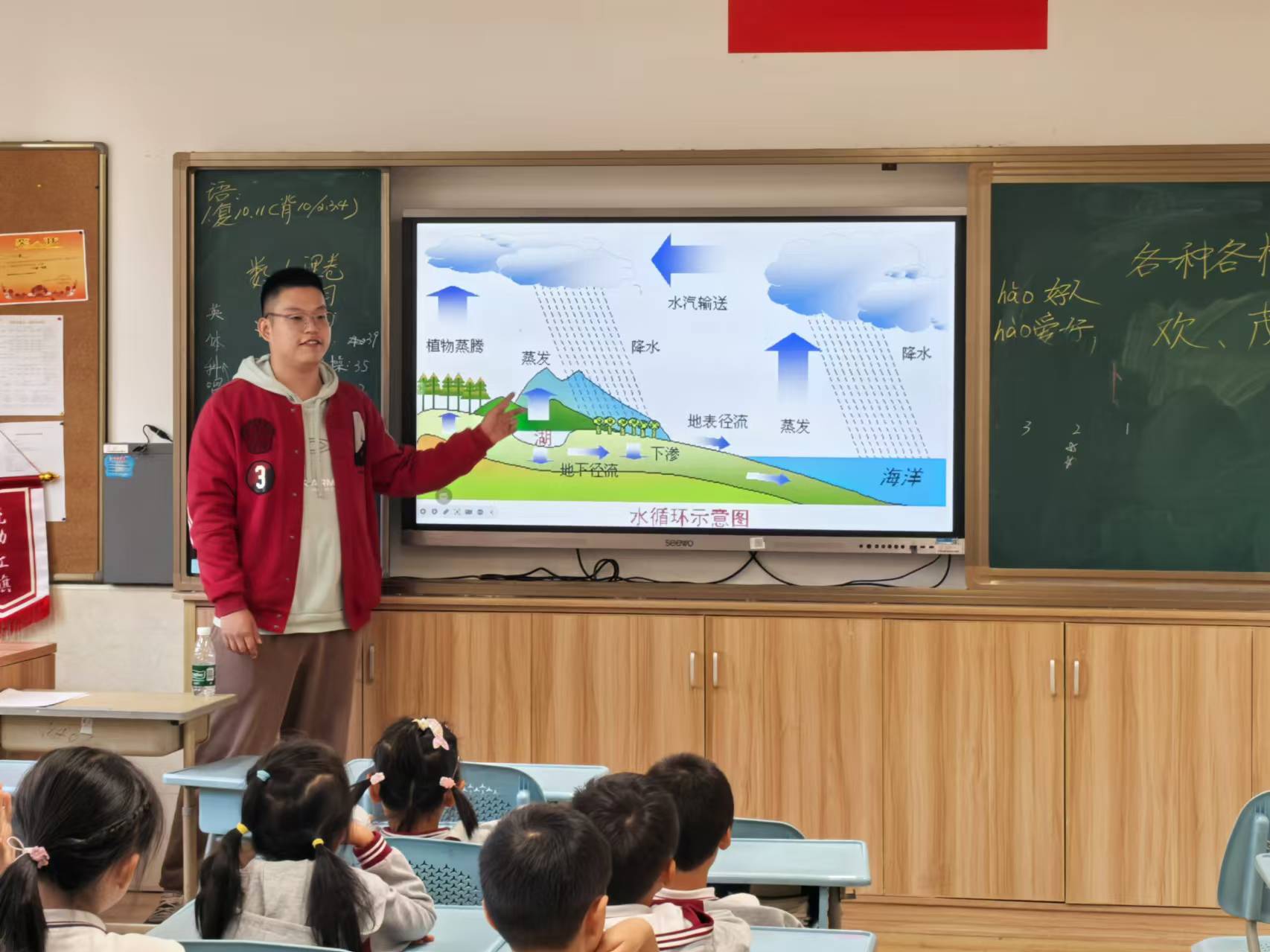 课程开始,讲师们先向同学们介绍了水的组成和水循环的过程,通过趣味视频和示意图展示了蒸发、水汽运输、凝结、降水、地表径流和下渗等水循环的具体流程,帮助同学们更好地理解。讲师们特别设置了“考一考”环节,同学们积极踊跃地举手回答问题,分享自己的见解。