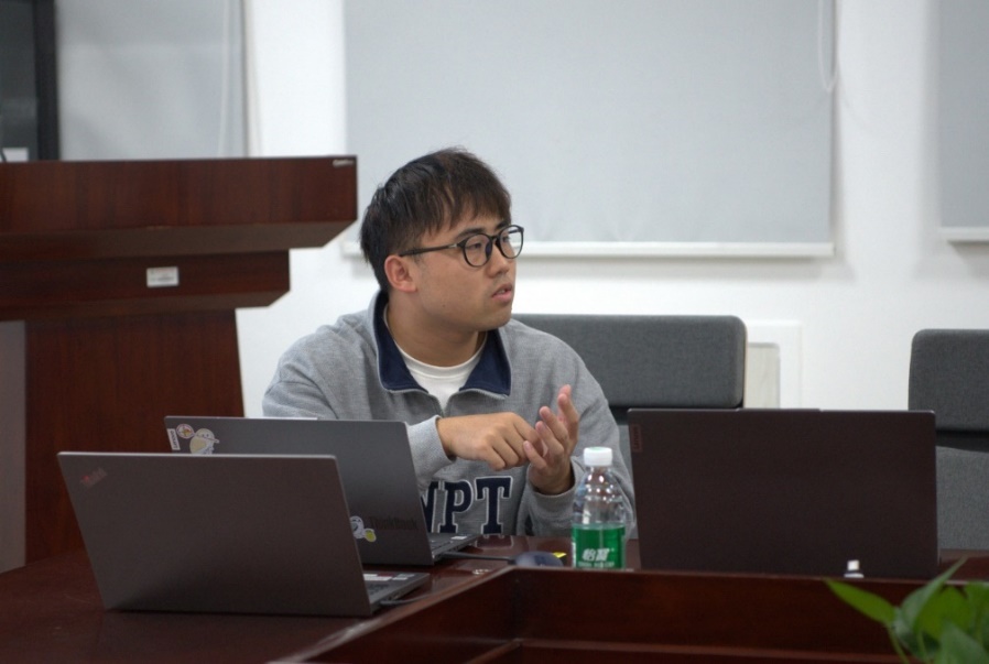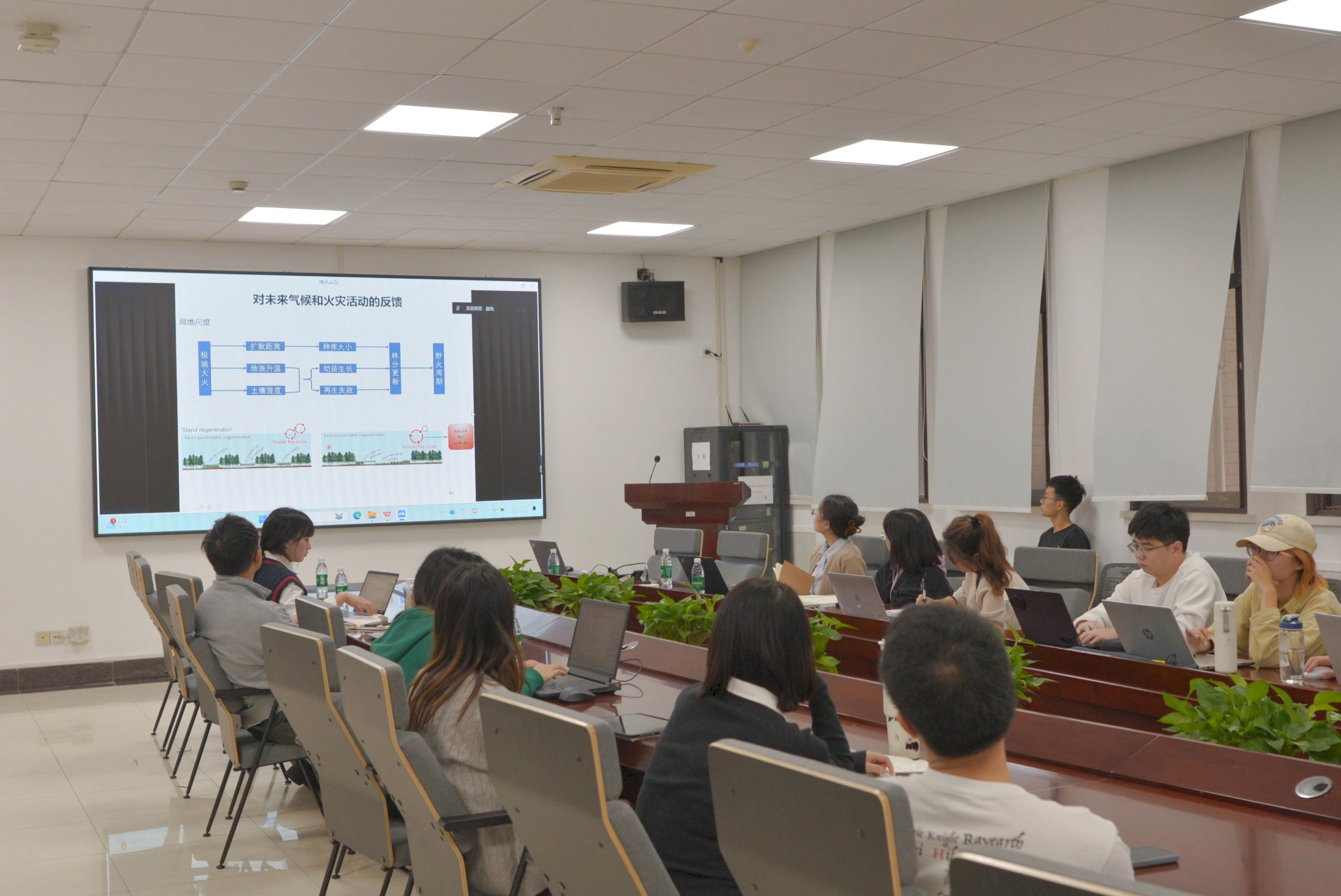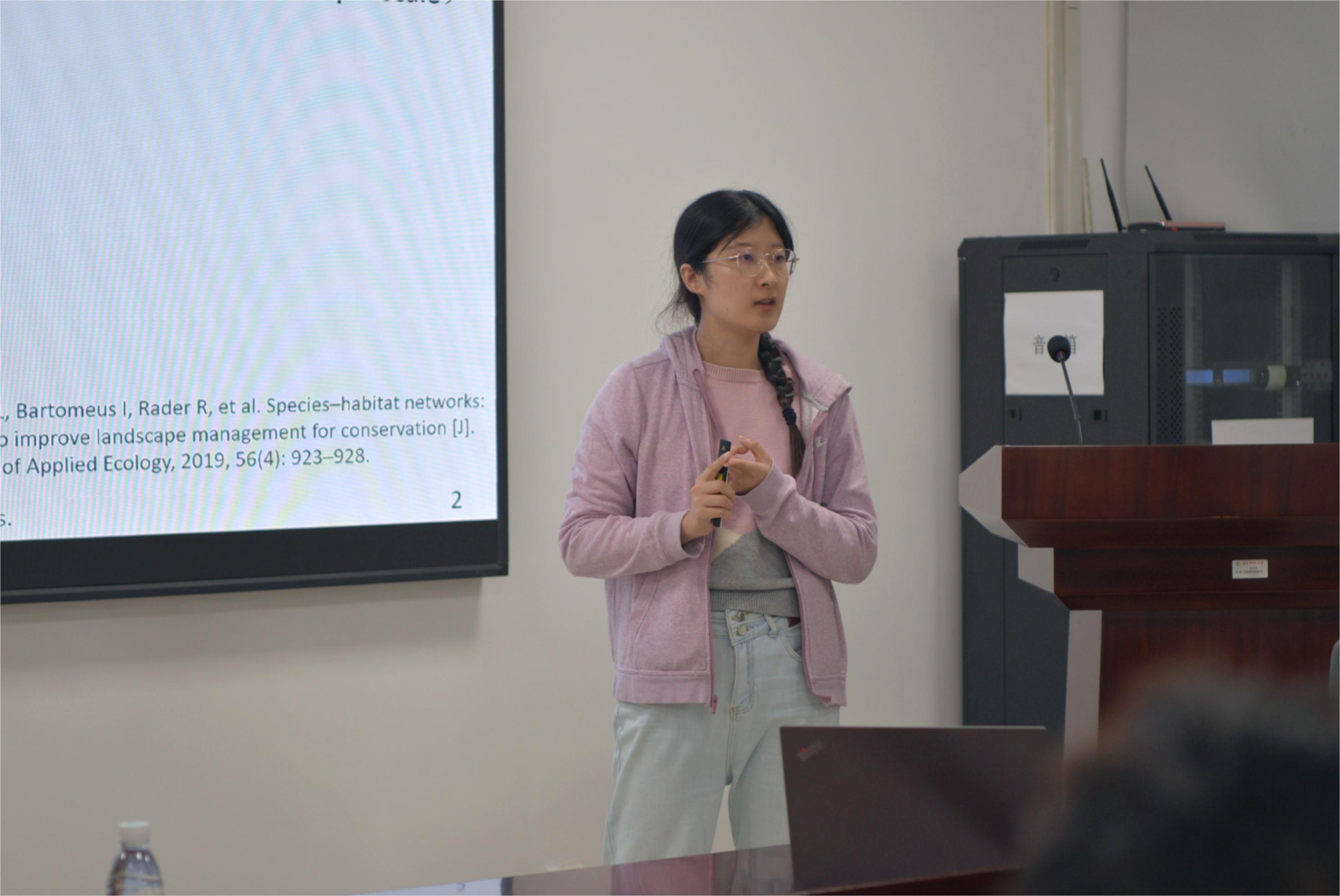 上半场的第一位汇报人是来自临沂大学的特邀报告人赵杰博士。研究发现,北半球温带和寒带森林中,火灾规模显著放大了火灾后夏季单位烧毁面积的地表变暖;随着阔叶树数量的增加,变暖及其随火灾规模的放大作用减弱;火灾规模增强的变暖可能会影响火灾后植被再生的成功和组成,以及冻土退化。该研究首次量化了火灾规模与火灾后地表变暖之间的关系,为森林管理提供了新的视角。第二位汇报人是来自毛秀光老师课题组的杨善琇,她口头报告的题目是《基于全基因组重测序数据研究菊头蝠属系统发育进化》。她针对菊头蝠15个群组中的10个展开研究,推测欧洲、非洲支系的物种可能是菊头蝠属的祖先类群,揭示了在菊头蝠属的近缘类群和远缘类群间,存在广泛的核基因渐渗现象。第三位汇报人是来自陈雪初教授课题组的张楠,她进展快报题目是《多生境景观更加多样化、稳定,功能更加完善》。研究发现多生境景观支持更高的物种和相互作用均匀性,在物种丧失时具备更稳定的鲁棒性,其中授粉成功率的提升与昆虫群落的互补性有关。