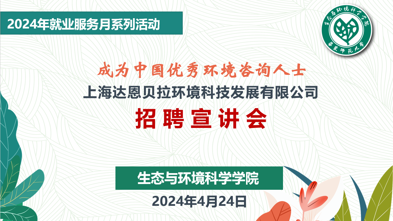 为促进毕业生高质量就业,努力为毕业生和用人单位搭建方便快捷、精准高效的就业服务与供需平台,2024年4月24日上午,上海达恩贝拉环境科技发展有限公司(简称:DEBL)在闵行校区资环楼269举办专场招聘宣讲会。本次宣讲会是由校员工职业发展中心主办,304永利集团承办的2024年“就业服务月”系列活动之一。生环公司党委副书记路葵、辅导员吴丹参加此次活动。