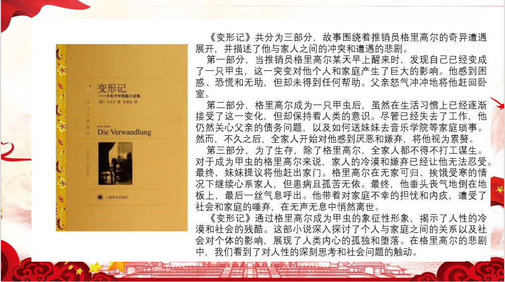 第三小组的同学阅读了《变形记》并围绕书中的主要观点进行了分享与交流。《变形记》的故事以一个显得匪夷所思的情节展开,推销员格里高尔变成了一只甲虫,这一变故对他和他的家庭带来了极大的冲击。在整个故事中,格里高尔尽管身处困境,他仍然关心家庭的大小事务,但却遭到了全家人的冷漠和嫌弃,最终导致了他的悲剧命运。