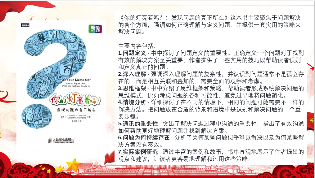 此次活动以小组讨论的形式进行,其中第一小组阅读了《你的灯亮着吗?》并围绕书中的主要观点与自己的科研经历进行了分享与交流,特别是关于如何在科研过程中识别真正的问题、如何设定正确的问题解决目标,以及如何在解决问题的过程中保持创新和灵活性等方面,进行了深入的讨论。