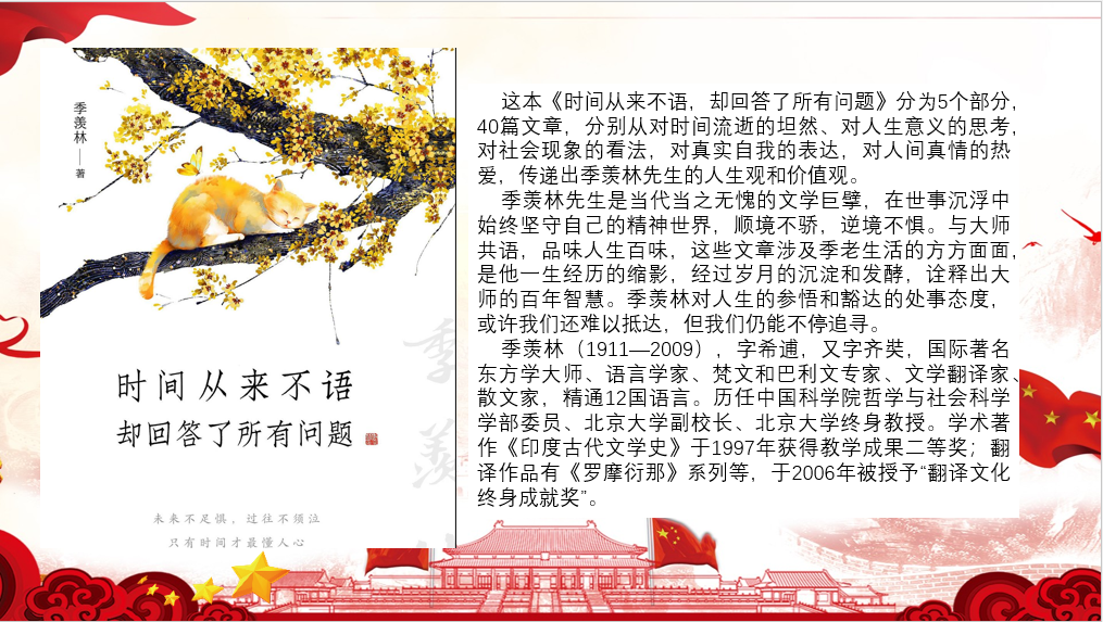 第二小组的同学阅读了《时间从来不语,却回答了所有问题》并围绕书中的主要观点进行了分享与交流。书中季先生的散文随笔让党员同学们深刻思考人生、社会、文化等多个方面。时间是无形却真实存在的力量,它能改变一切,却又公平无私,不偏袒任何人。博士生党员们也深受季先生对生活的态度所感染。虽饱经世事,季先生依旧保持乐观豁达的心态,他认为人生是一段旅程,重要的是享受途中的风景,而非急于达到终点。季先生对高尚精神追求的坚持更令我敬佩。他不懈致力于中国文化研究,怀着对传统的深厚热爱,希望让全世界更好地了解中国文化。读后的感悟包括:《时间从来不语,却回答了所有问题》是一本值得反复阅读的书,其中的精彩句子深深触动了大家,时间既无情又公平,我们要珍惜每个时刻,享受人生旅程,保持乐观的心态。同时,精神追求比物质富有更为重要。