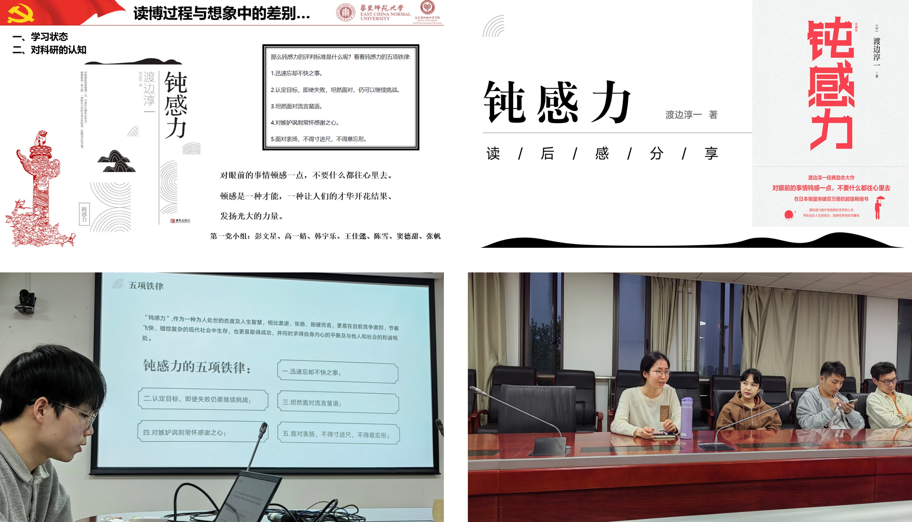 为提高大家对科研和自我的认知,保持良好的学习状态,第一党小组分享的书籍是《钝感力》。“钝感力”是一种大智若愚的人生态度和人生智慧,更容易在现代社会立足;是保持身体健康的动力;是一种让恋爱关系长久维系的恋爱能力;是可以使你在职场上出人头地,笑到最后。保持钝感力要做到五项铁律:迅速忘却不快之事;认定目标,即使失败仍要继续挑战;坦然面对流言蜚语;对嫉妒讽刺常怀感谢之心;面对表扬,不得寸进尺,不得意忘形。