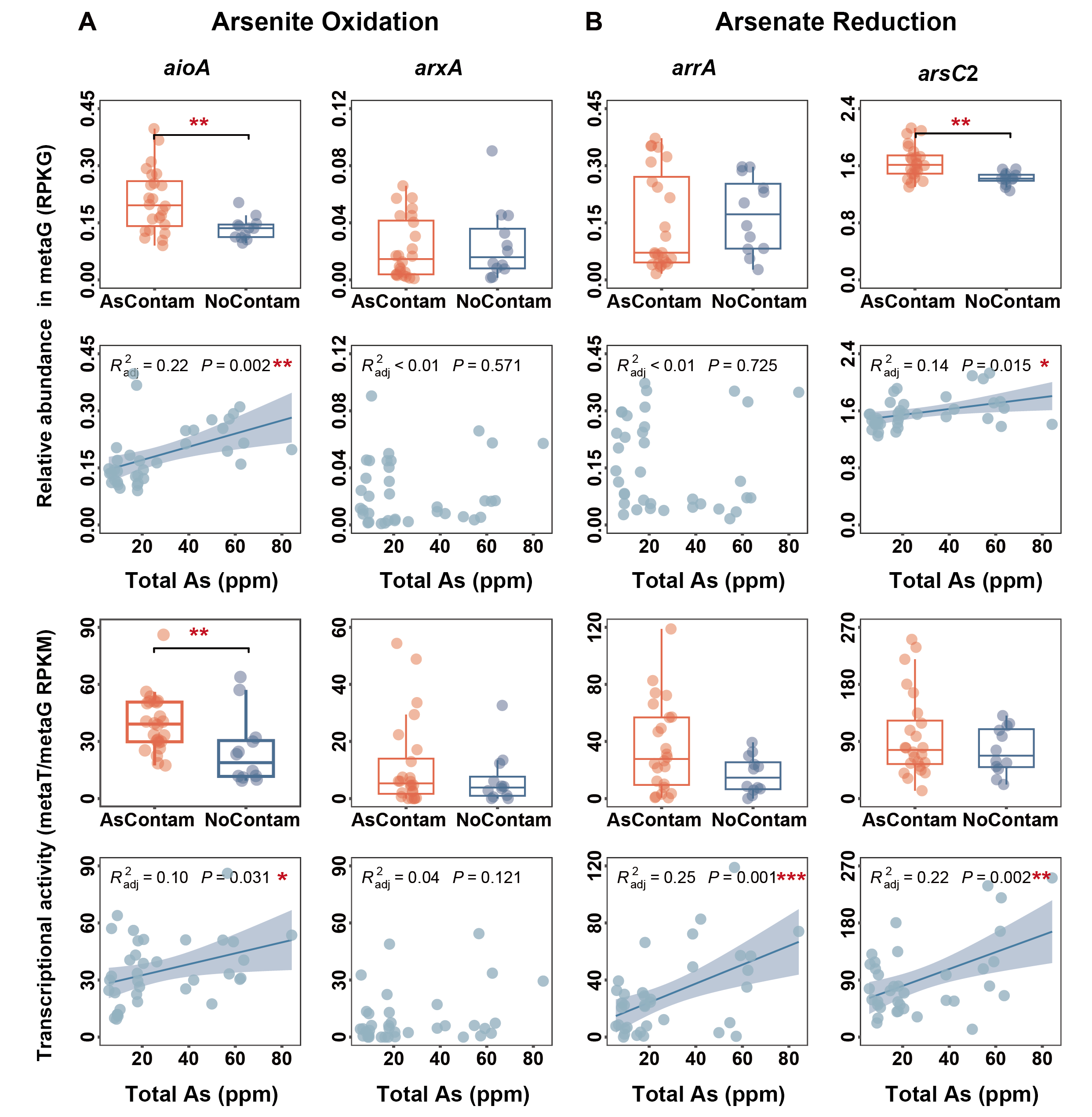该研究采集了中国南方12个地区的稻田土壤,对其砷污染程度和相关代谢基因进行基因组和转录组水平的分析。通过构建和应用ROCker model来准确检测宏基因组和宏转录短读数据(short reads)中的砷氧化(aioA/arxA)和砷还原(arrA/arsC1/arsC2)基因,结果表明,aioA和arsC2分别是参与亚砷酸盐(As(III))氧化和砷酸盐(As(V))还原的主要微生物群落,并揭示了As(III)氧化与反硝化作用、As(V)还原与甲烷氧化之间存在耦合代谢潜力。同时,该研究强调了新型As(III)氧化基因arxA在碱性土壤中发挥着重要作用。