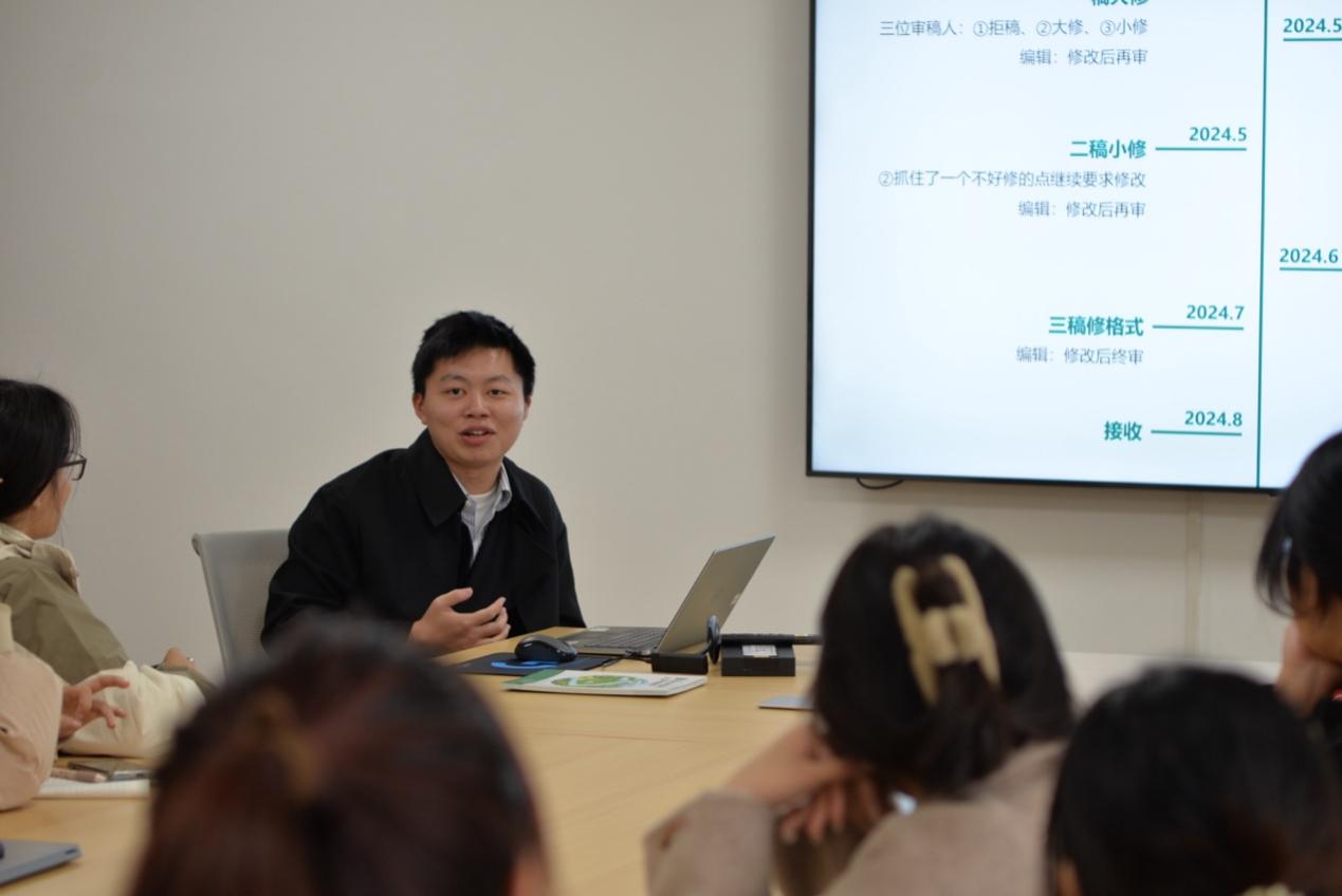 曾鹏同学从个人经历出发,分享了自己的科研经验与国奖申请经验。首先,曾鹏同学就科研实践总结了“三个多”经验——多学、多问、多交流。多学一是指熟悉课题组研究方向,厘清个人研究目标;二是指明确国内外研究进展,确保研究的创新性;三是掌握前沿的理论方法,夯实研究基础框架。多问一是学会向行业大佬提问,拒绝迷信权威;二是积极向导师咨询沟通,不懂就问;三是多向师兄师姐们请教,学习经验。多交流一是积极参加领域学术会议,掌握同行研究进展;二是与国内外学者建立联系,实现合作共赢;三是多与同学进行学术交流,群体头脑风暴。之后,曾鹏同学分享了科研写作的相关经验,强调了写作规范、写作表达、合理运用人工智能和翻译工具以及积极群求修改建议的重要性。最后,曾鹏同学进行了国奖经验的分享。国家奖学金不仅是对个人学术成就的认可,更是对追求卓越、勇于创新精神的鼓励。因而它要求我们从科研能力、思想品德、语言表达、社会服务等多方面严格要求自己。