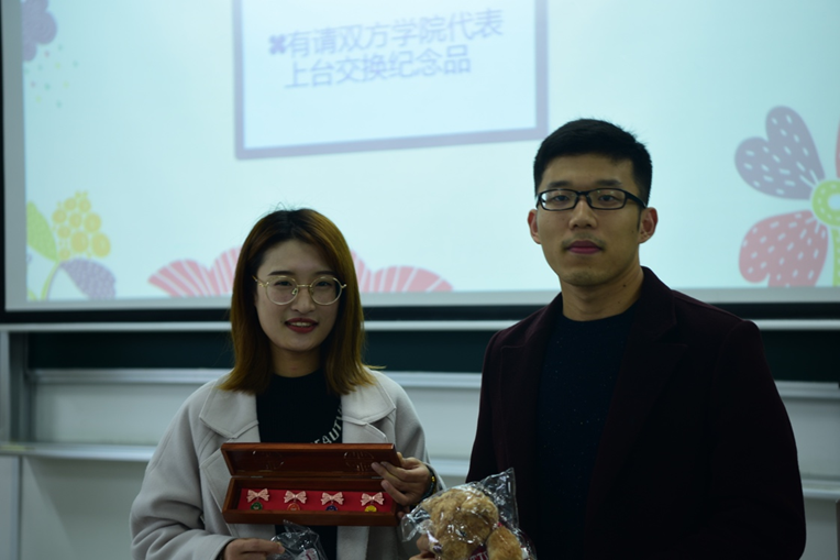 开场是参与者准备的情歌对唱环节带动氛围,双方公司互赠公司纪念品。接着,双方分别派代表发言讲述了两校的校史,让两校同学增进了对彼此公司历史文化的认识。