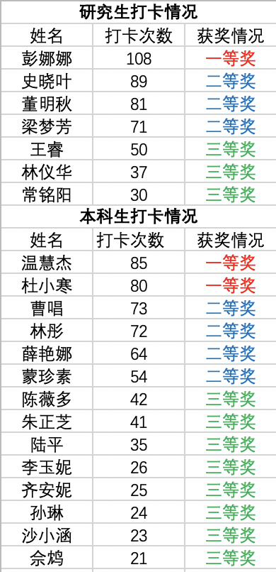 活动结束时,大部分同学在超过一半的时间里完成了早睡、早起打卡。也有不少同学坚持分享读书笔记,学习英语或者拓展学科外的知识,自学计算机或者另一门外语。更有个别非常自律的同学做到了几乎全勤打卡。勤奋的同学在打卡时也无形中督促了其他同学的打卡,使得更多的同学参与到其中,形成一种良好的氛围。